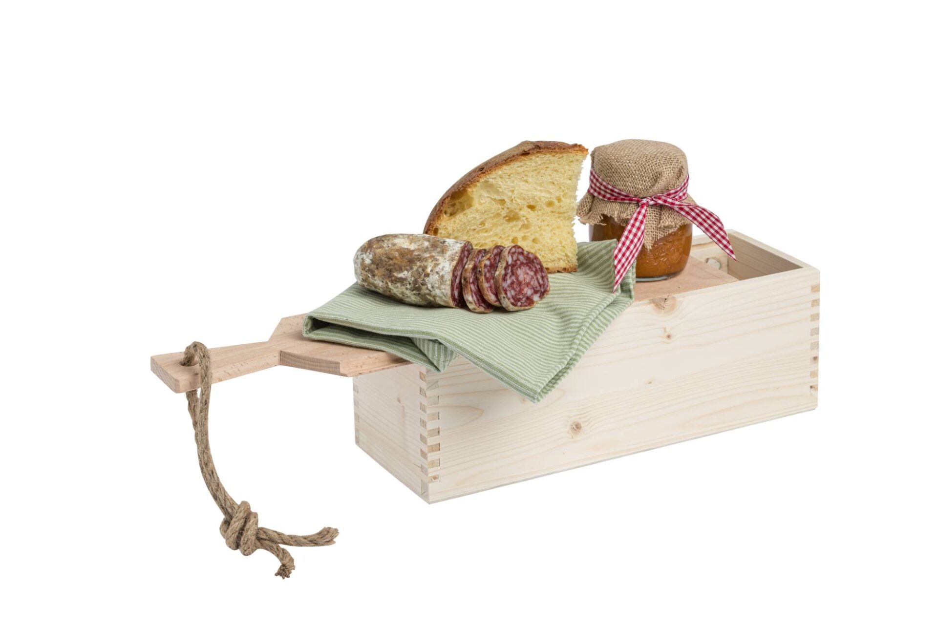 • Holzkiste mit Buchenholzdeckel in Form eines Schneidebretts zur Präsentation von Produkten