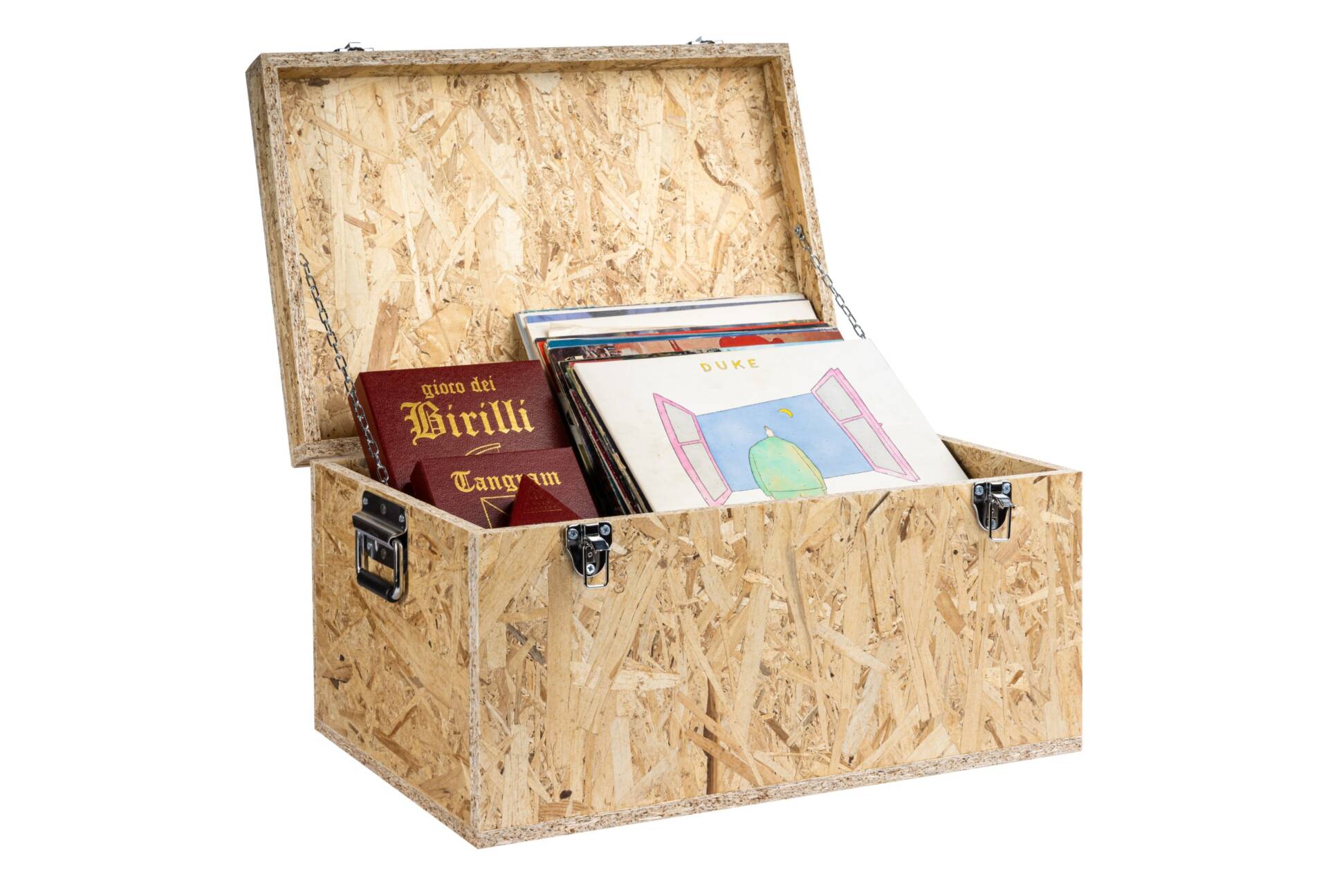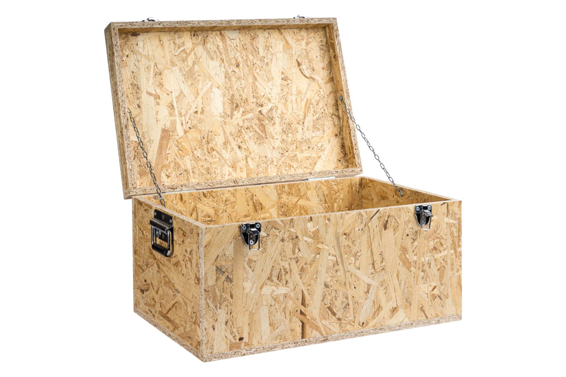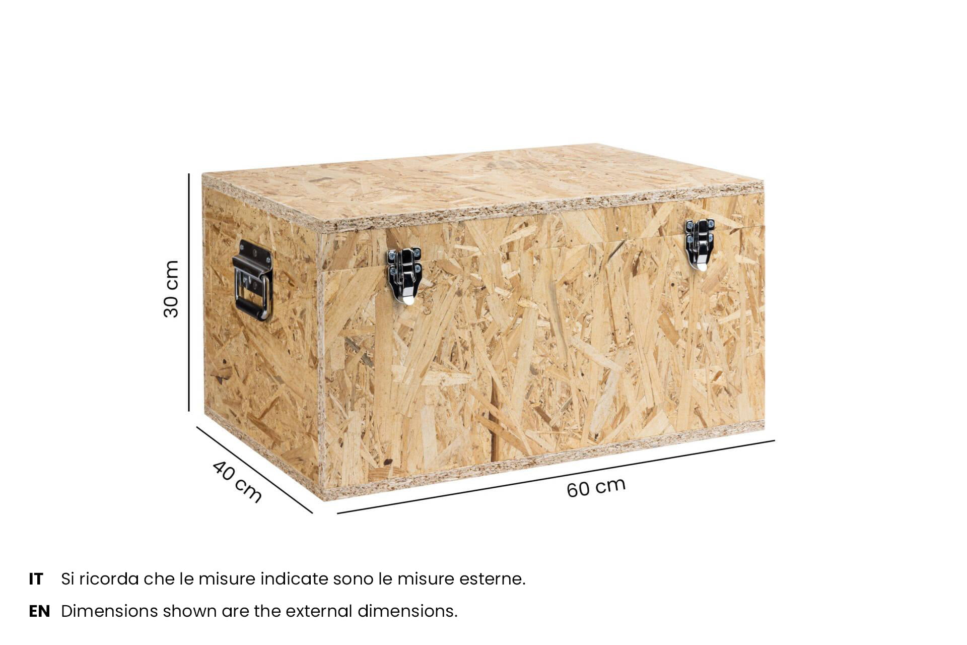 • Mallette type coffre en OSB avec deux charnières en métal galvanisé, deux crochets en métal, deux poignées sur les petits côtés pour la préhension et des chaînes internes pour soutenir le couvercle