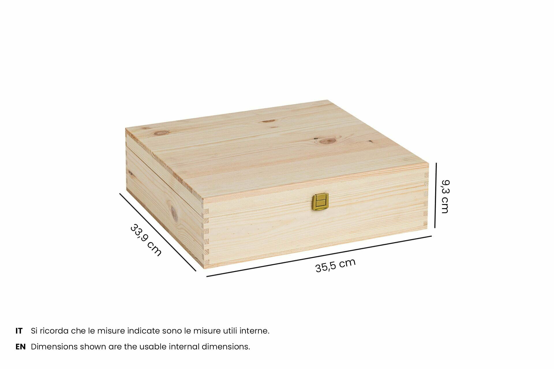 • Cassetta in legno con chiusura a gancetto metallico sulla parte frontale e due cerniere metalliche sulla parte retrostante