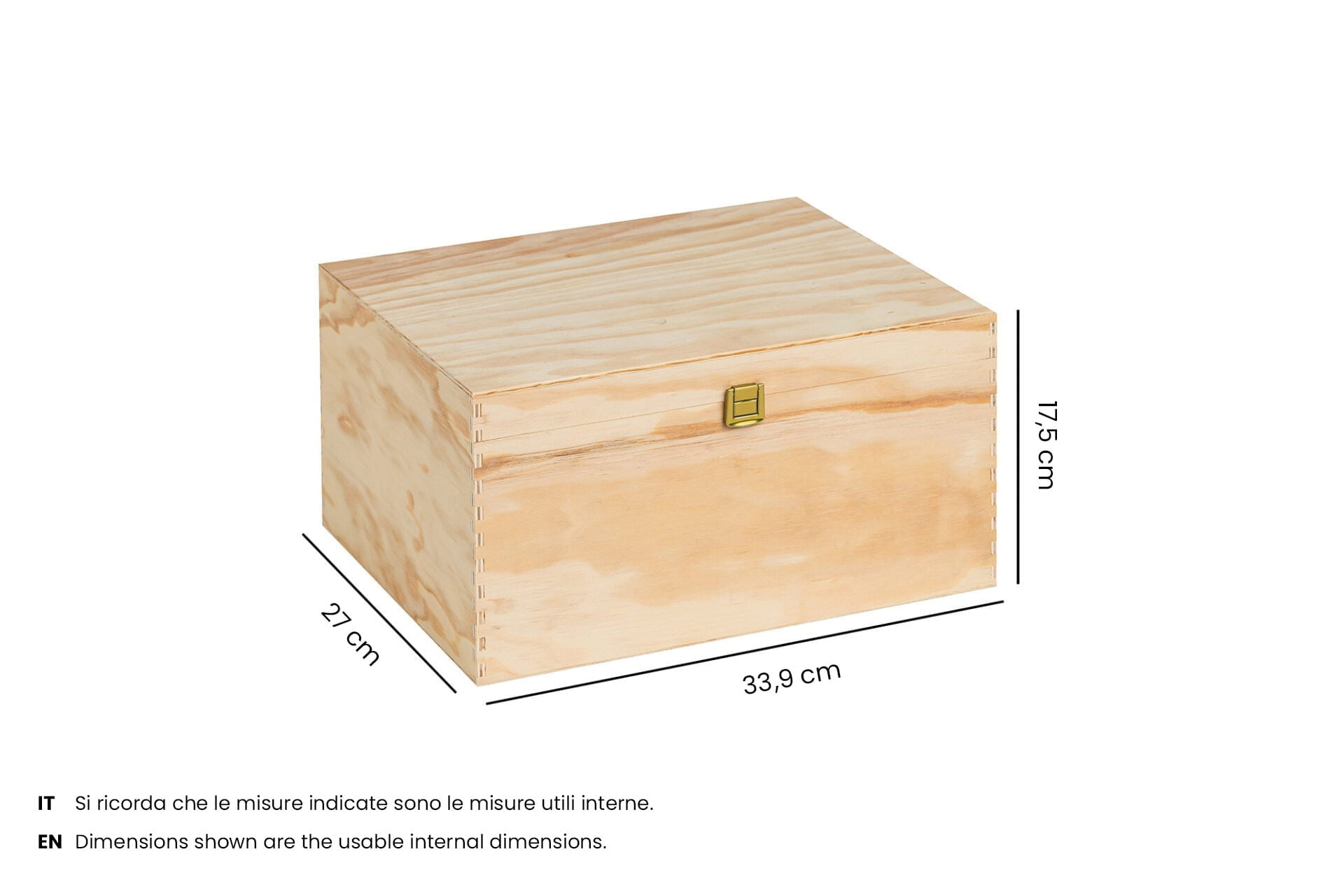 • Cassetta in compensato di pino con chiusura a gancetto metallico sulla parte frontale e due cerniere metalliche sulla parte retrostante