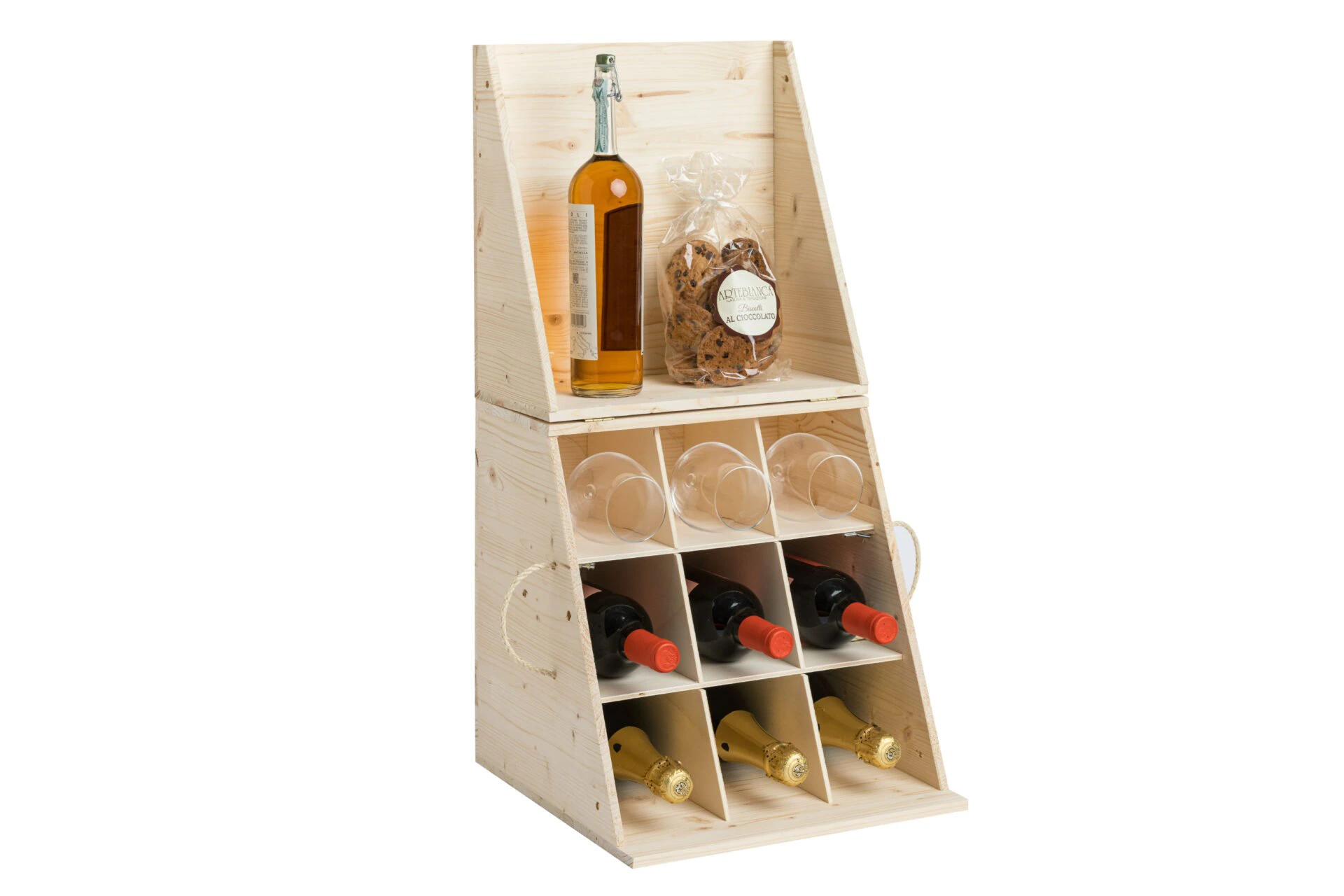 • Cassetta in legno espositiva indicata per contenere bottiglie di vino stese ed esporre sul piano a ribalta prodotti di diverso genere