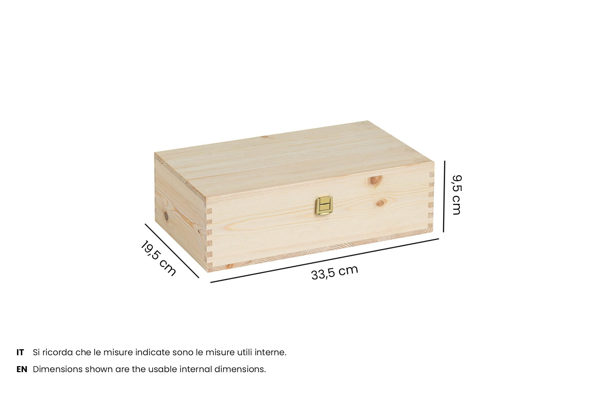 • Cassetta in legno con chiusura a gancetto metallico sulla parte frontale e due cerniere metalliche sulla parte retrostante