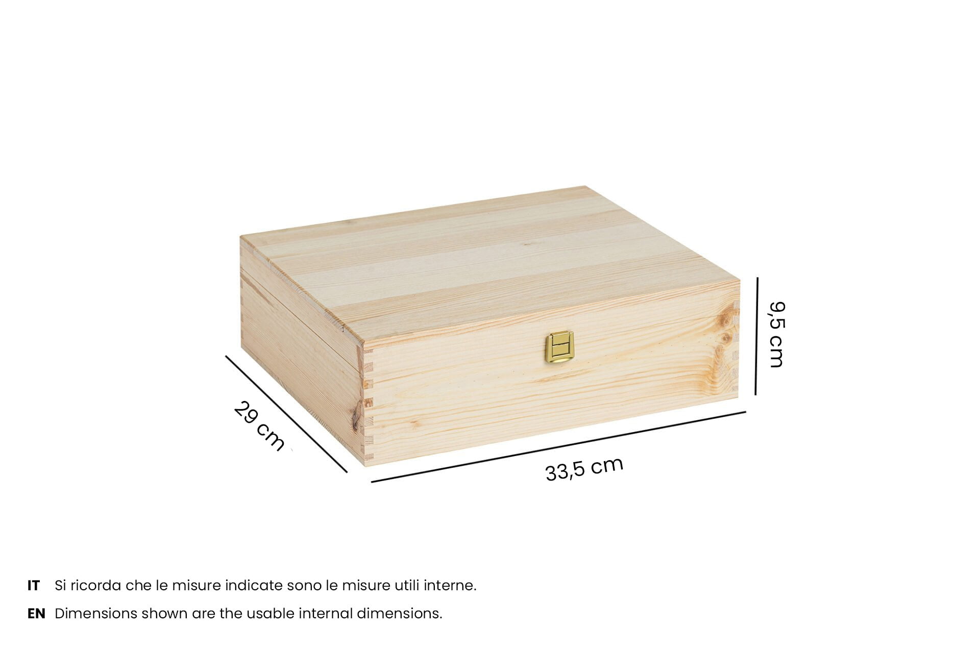 • Cassetta in legno con chiusura a gancetto metallico sulla parte frontale e due cerniere metalliche sulla parte retrostante